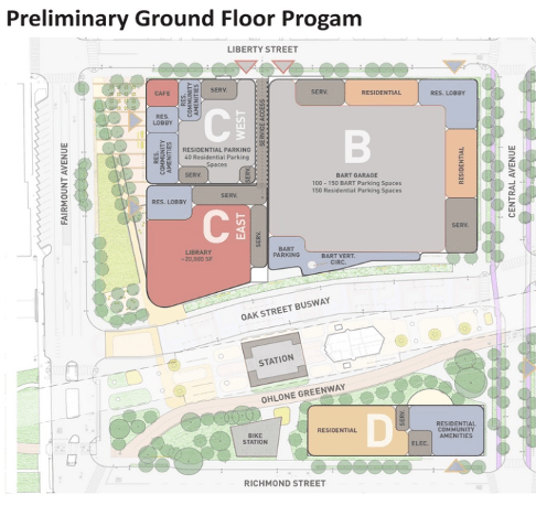 The outdated ground floor layout shown above suggested the new library would be located in C-EAST as shown. Current information now has the proposed location moved to C-WEST on Liberty Street. Current information also shows that C-WEST construction is now in Phase 3, for which construction would start in late 2024.