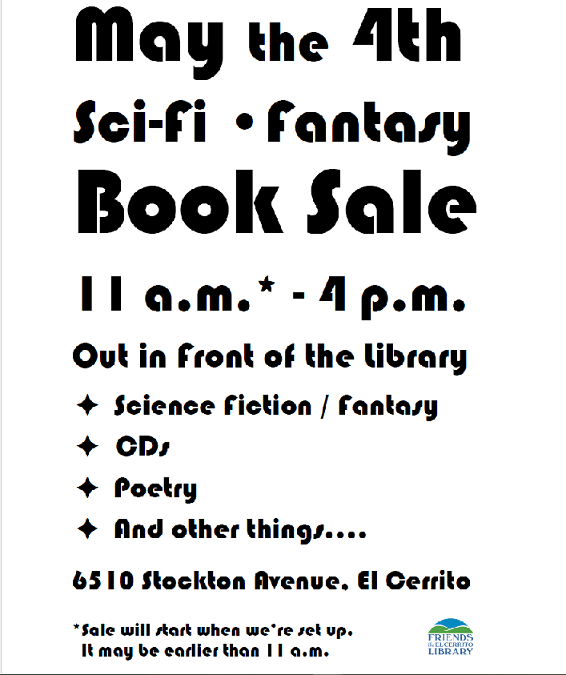 Sci-fi / Fantasy Book Sale – Sat., May 4th A pop-up sale in front of the library. 11 am to 4 pm. May the fourth be with you! Meanwhile, we welcome book donations. Share this: Click to email a link to a friend (Opens in new window) Email